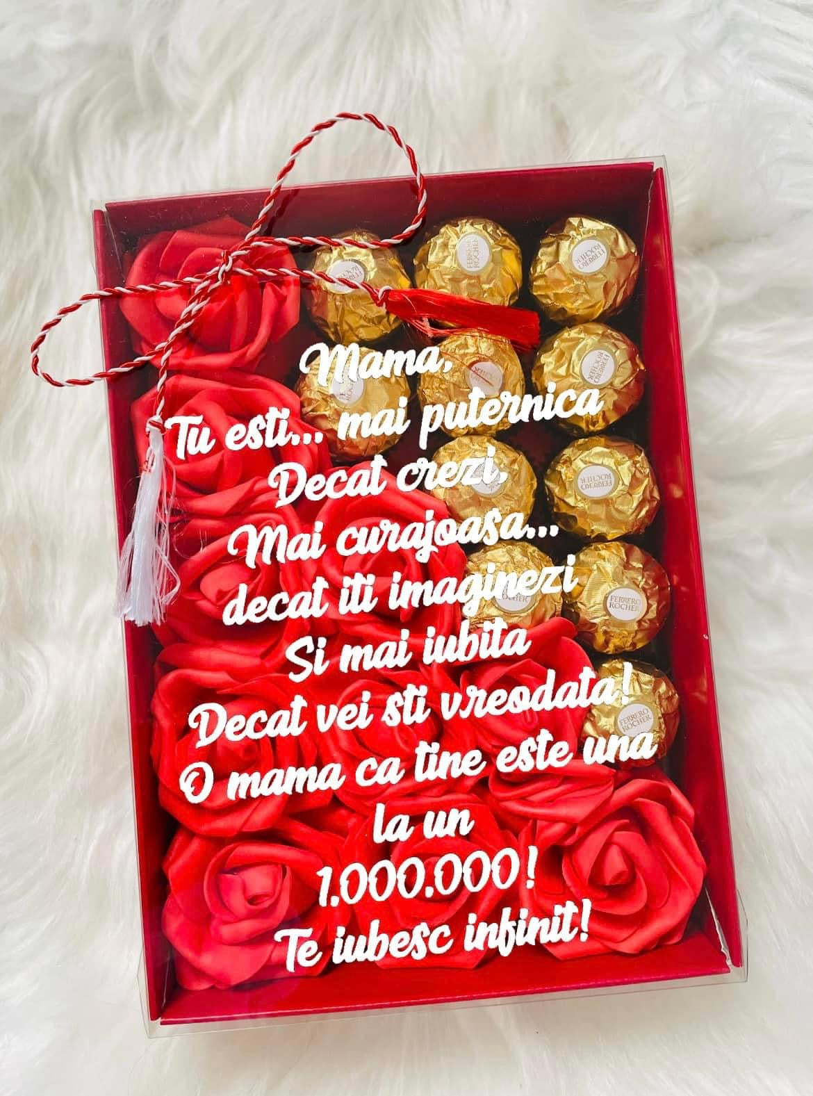 Cutie cu Fererro Rocher și trandafiri personalizată cu mesaj