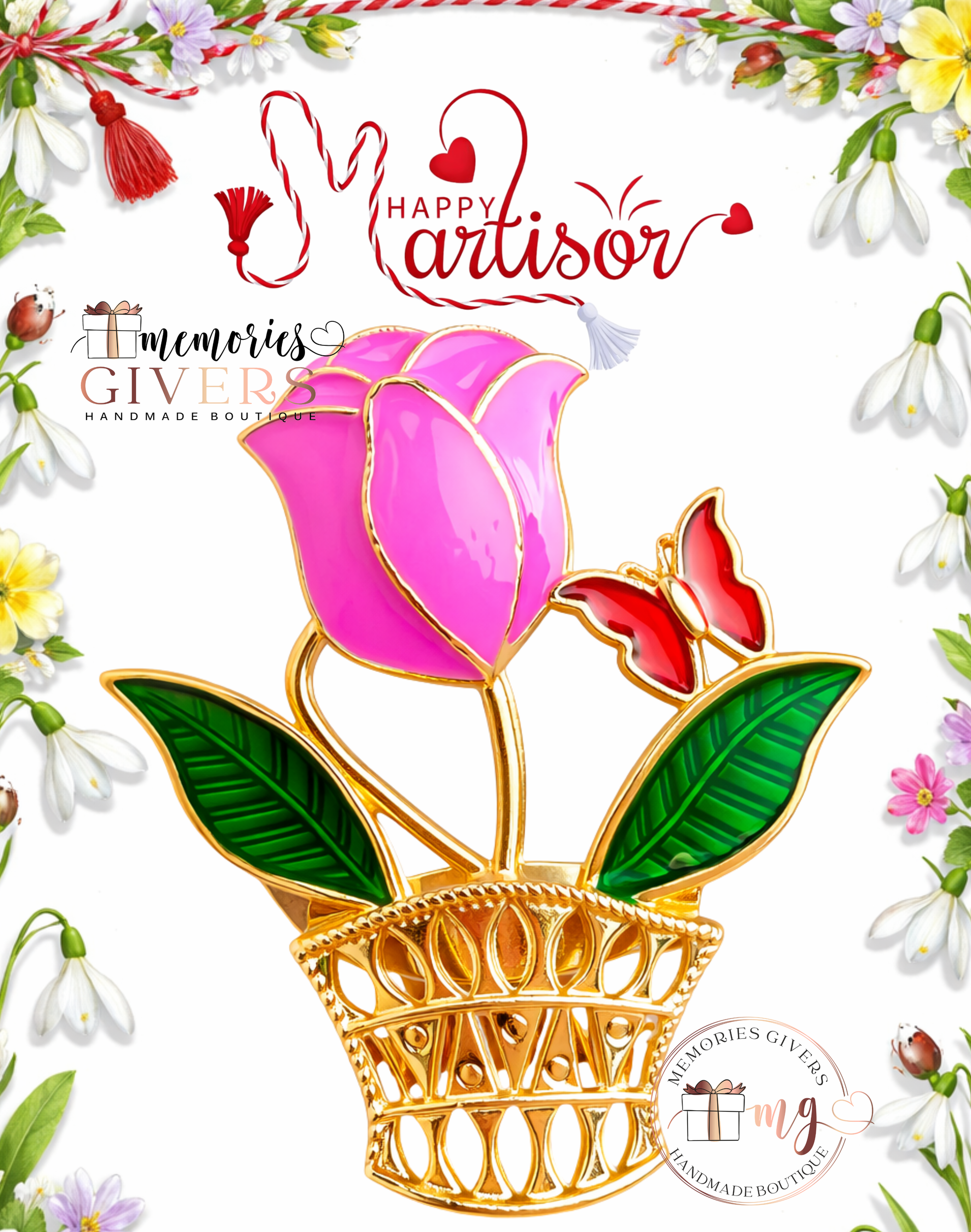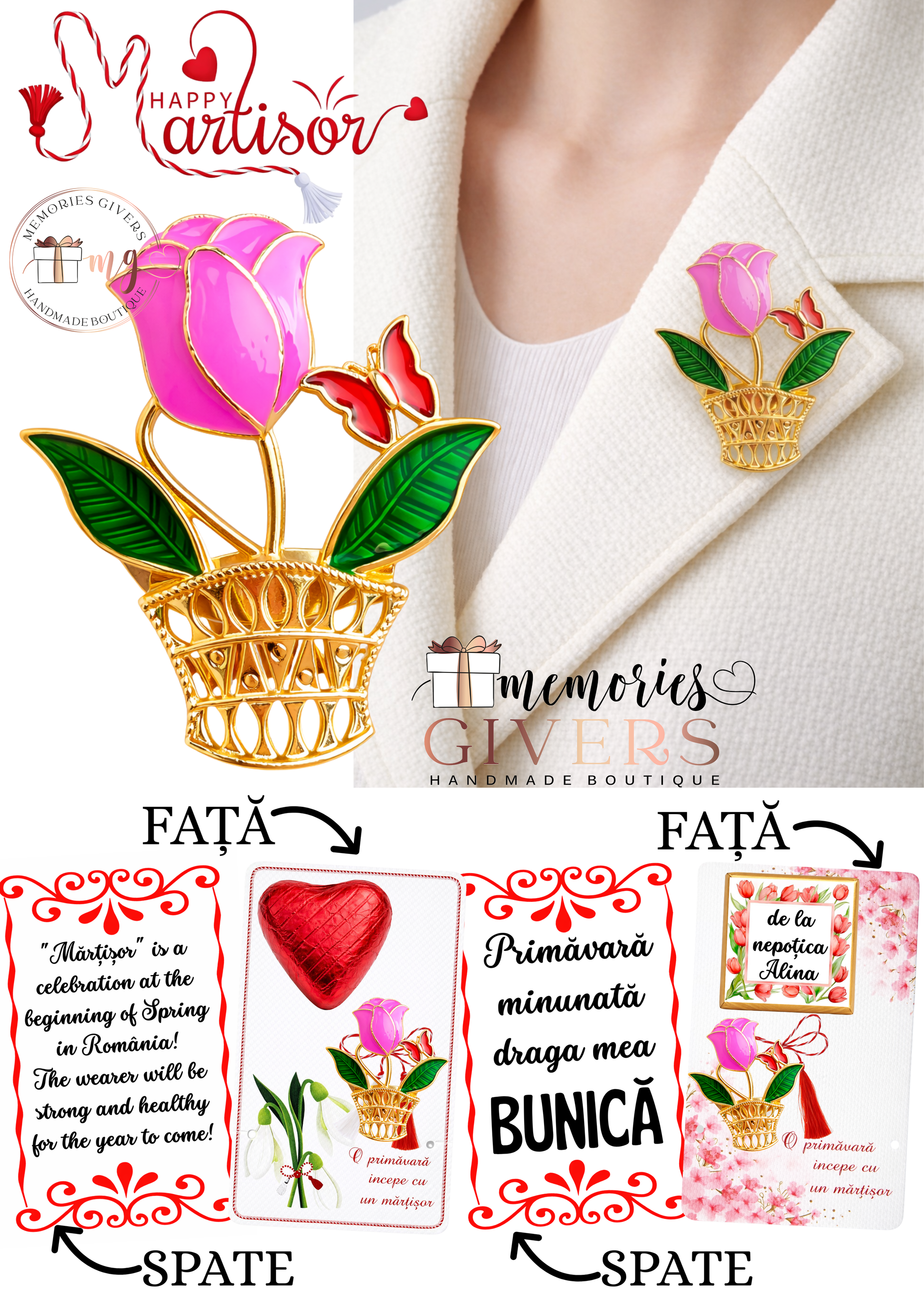 Broșă -LALEA ROZ- cu sau fără mesaj pe spate și ciocolată