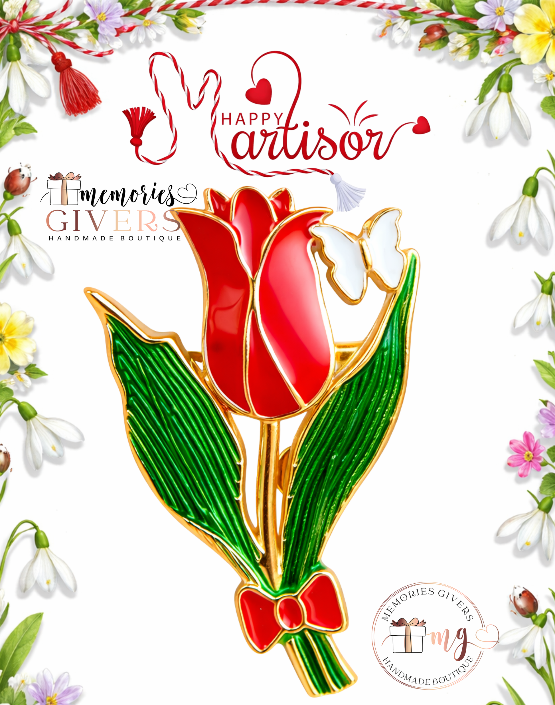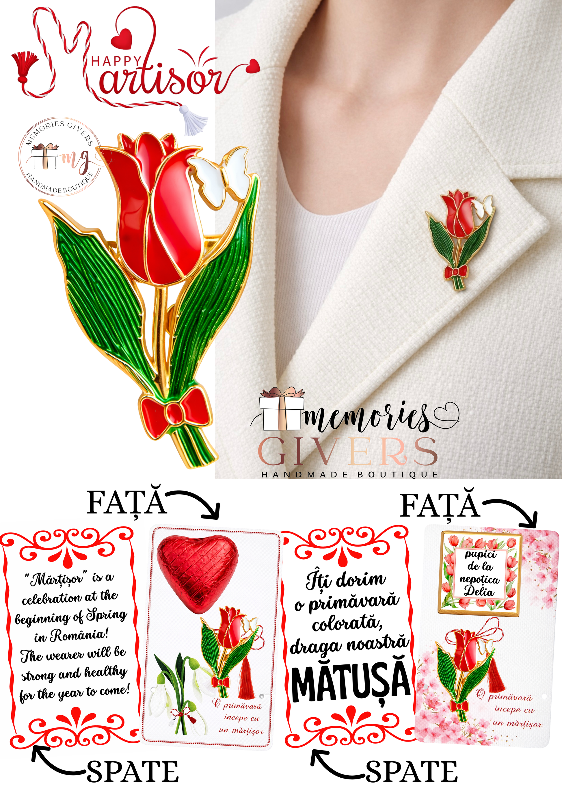 Broșă -LALEA ROȘIE- cu sau fără mesaj pe spate și ciocolată