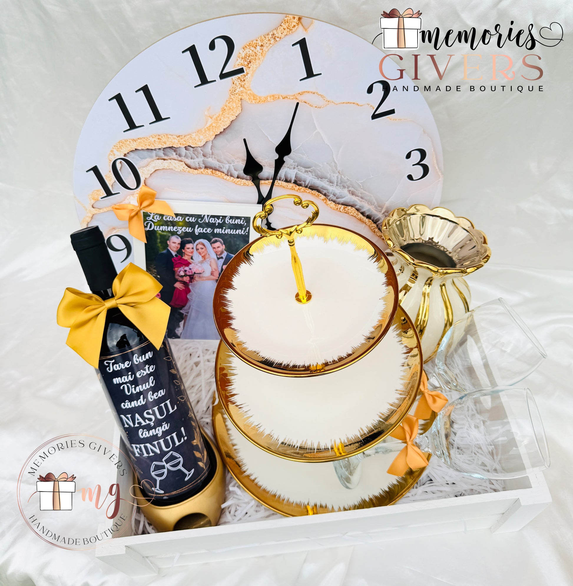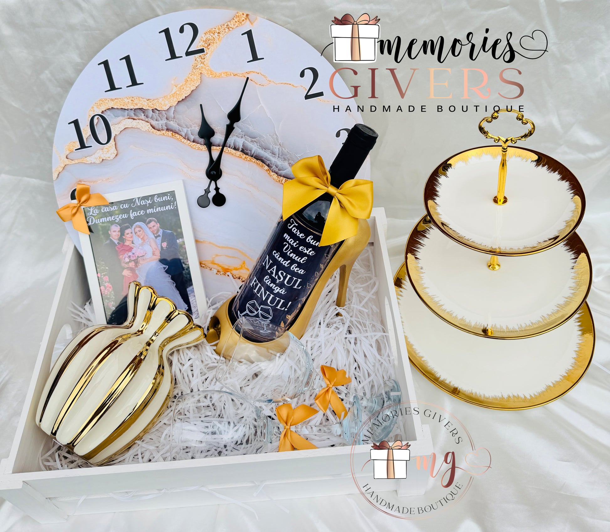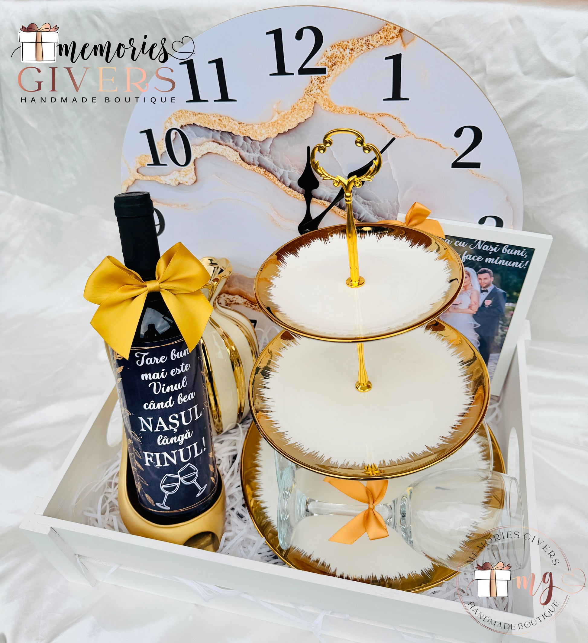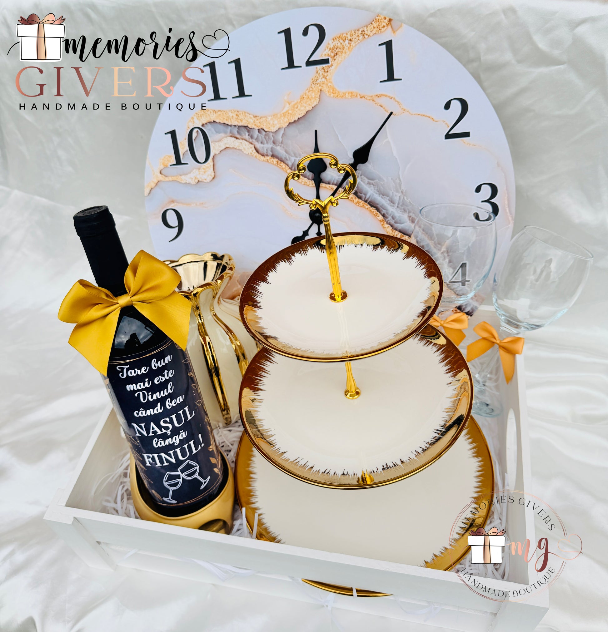 Lădiță din lemn cu ceas, vază flori, suport cu 3 etaje, sticlă cu suport & pahare